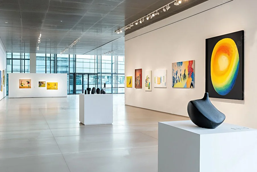 Die Kunst kann in die Architektur und das Innendesign integriert sein oder in Form von wechselnden Ausstellungen präsentiert werden.